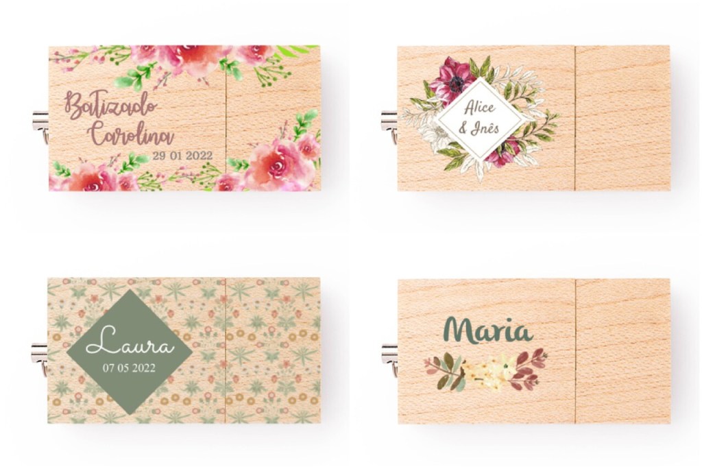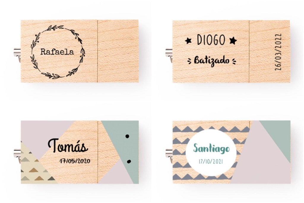 As pens são um excelente produto para guardar os ficheiros digitais de todo o batizado e oferecer aos padrinhos e restantes familiares. São a escolha certa para aqueles que querem ter a possibilidade de carregar as suas memórias na palma da mão (e assim evitam que as percam no computador ou no telemóvel!).